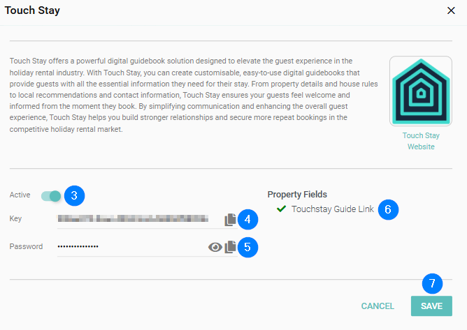 - Property Fields - The ''Touchstay Guide Link'' will automatically generate for you under Property Management / Properties / Booking Fields