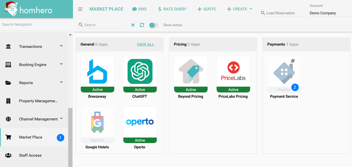 - Click Market Place from the Homhero side menu.