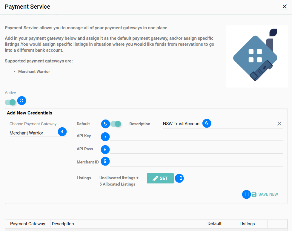 - Assign this as the Default payment gateway, or select specific listings in step 9.