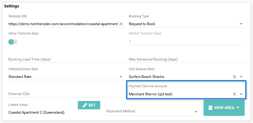 - You can also assign the Payment Service Account via the Listing settings. Example below: