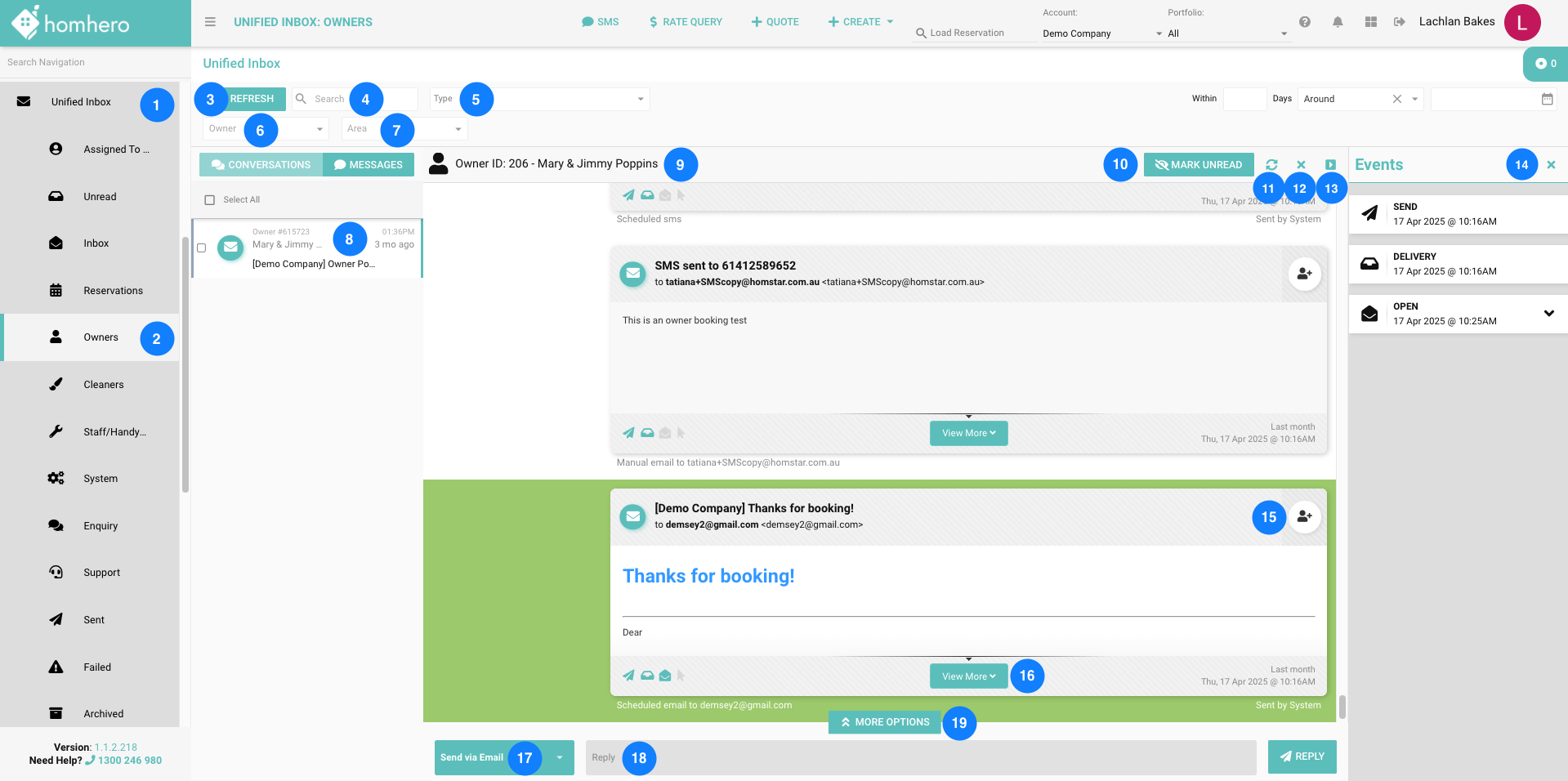 - If you click on a Message, you will see an Events breakdown, which will show you any tracking of that particular message. Otherwise, you will see an Overview of the owners contact details, their Properties, and any property notes.