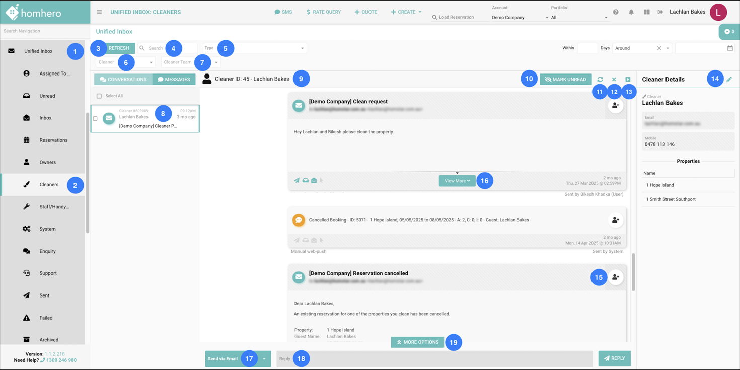 The Cleaners tab within Homhero's Unified Inbox is a central hub for managing Cleaners communication. It provides a streamlined view of cleaner profiles and communication, ensuring cleaning operations remain organised and efficient.