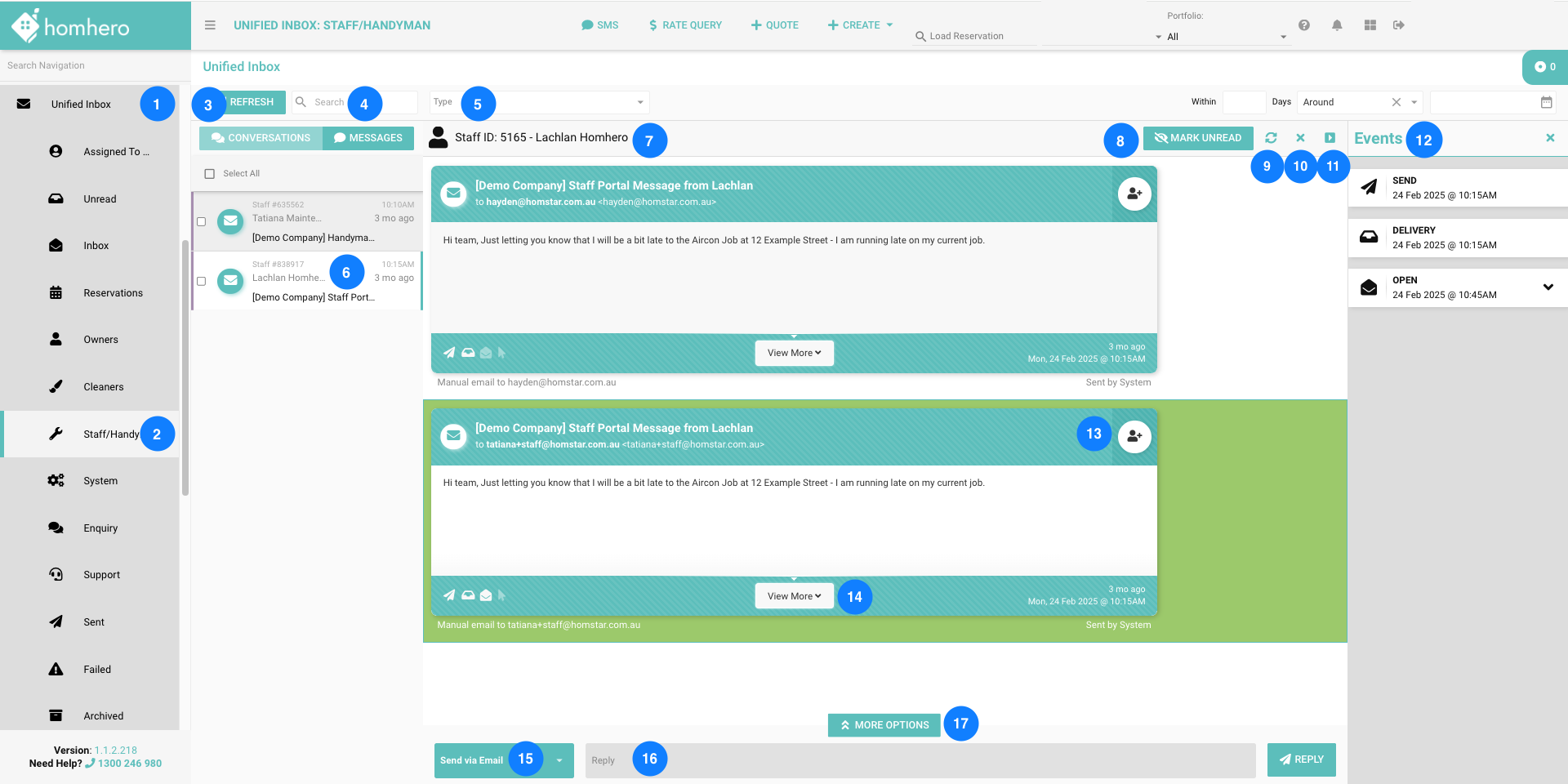 The Staff/Handymen tab within Homhero's Unified Inbox allows you to manage and communicate with your internal team and maintenance staff quickly and efficiently. It brings all staff-related conversations into one organised space, enabling clear communication, streamlined workflows, and faster response times for property tasks and maintenance issues.
