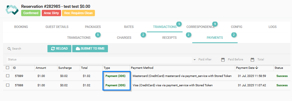 A 3D Secure payment will be marked with the '3DS2' payment type. You can view this under Transactions > Payments on the reservation in Homhero.