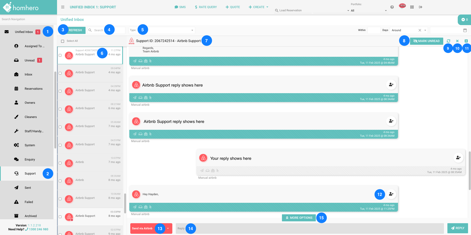 The Support tab within Homhero's Unified Inbox is a specialised inbox designed to separate Airbnb support messages from regular guest communication. This distinction is essential for maintaining clarity between guest interactions and communication with OTA support teams, such as Airbnb.