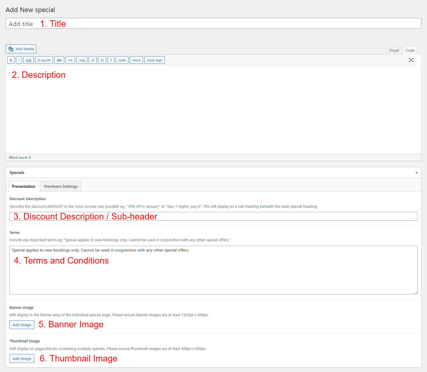 - Terms and conditions - Put any additional terms and conditions here - please note that anything related to the start/end dates of the special will be appended automatically based on the date settings entered later, so you don't need to add this here.