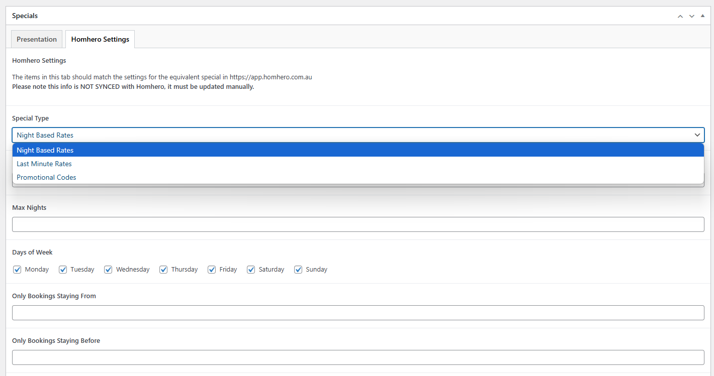 The fields that appear under this will change depending on the type of special that you have selected. But importantly, the names of the fields should match the ones in Homhero, so all that needs to be done here is that the same details you entered in Homhero should be entered here.