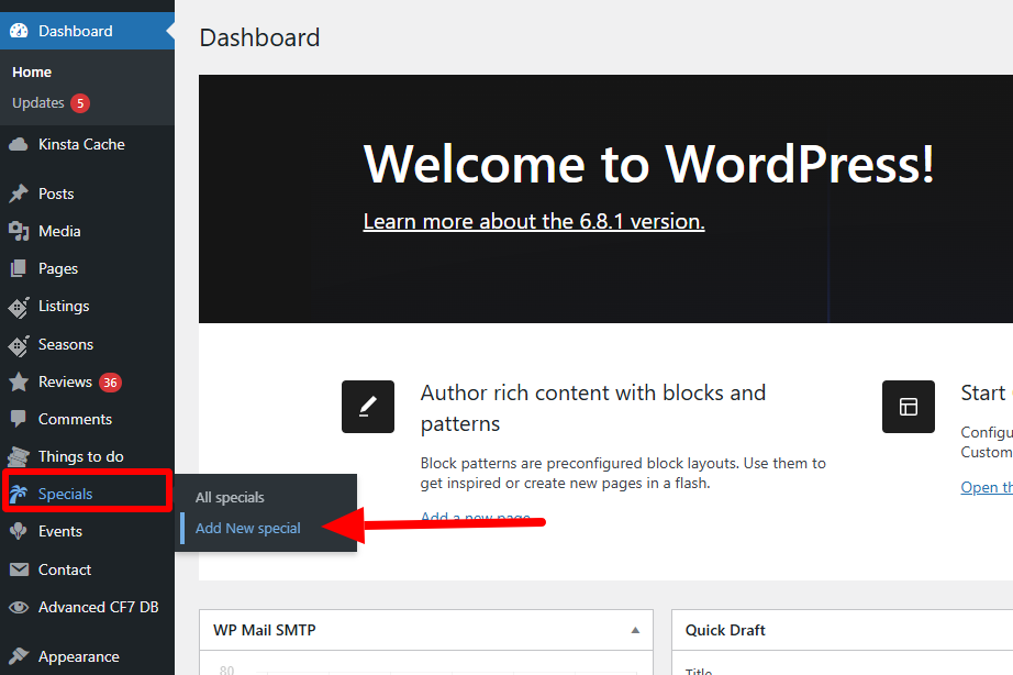 In the dashboard of your website, you should see the Specials option on the left hand menu. Hover over this and select "Add New Special"
