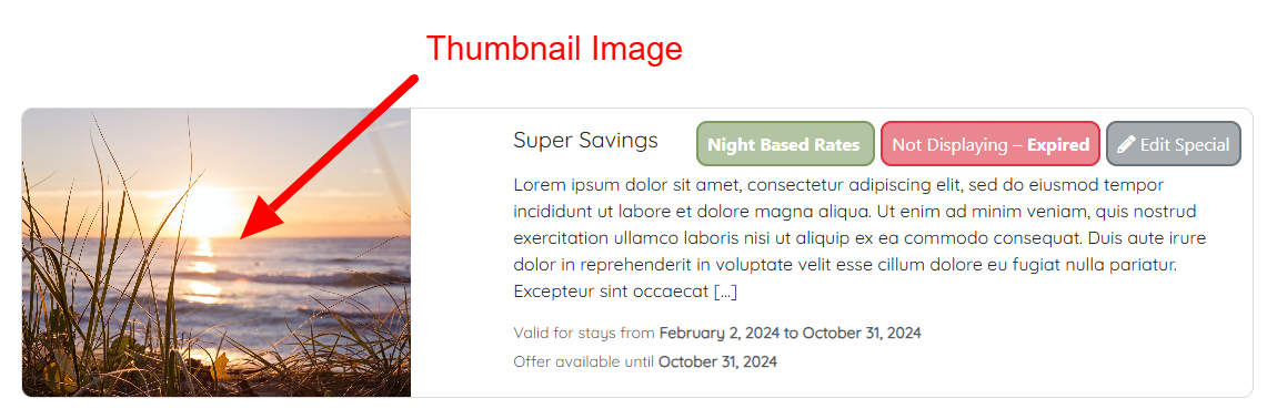 Please note that the three coloured boxes on the top right are only visible to the website administrator and show info about the type of special, whether or not it is visible to website guests (the below example is NOT) and a link to edit the special. This is where the thumbnail image displays.