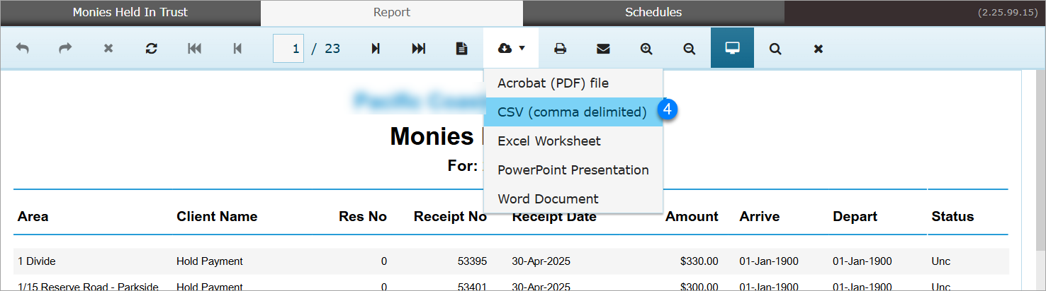 - Menu Search type Monies and choose Reports + Owner Accounting + Monies Held in Trust