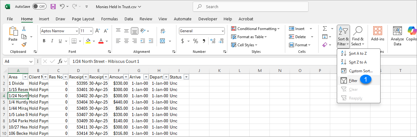 If there any transactions that are negative, please report them to your Trust Trainer or Homhero Support immediately (please only copy them to another tab, do not move them) - Filter column C Res No and sort – any Owner or Client will have a “0” in the Reservation number column and the departure date 1-Jan-00.