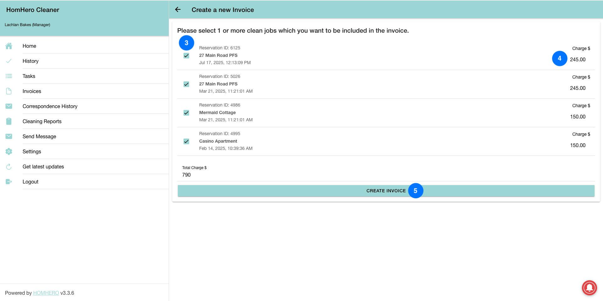 - Once you have selected all of your cleans, confirmed prices, click Create Invoice at the bottom of the screen.
