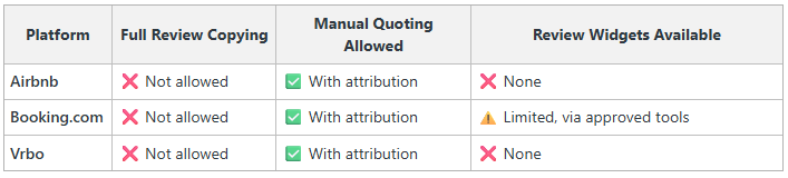 - Vrbo and Booking.com have similar restrictions, particularly around using reviews for commercial gain or display outside of approved environments.