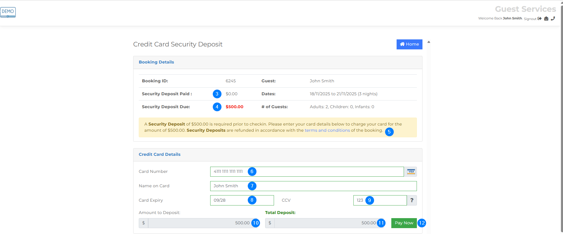 - The Total Deposit will be shown, including any surcharges applicable to the card type used. However, you have the option to disable surcharges on security deposits within your Guest Portal Settings.