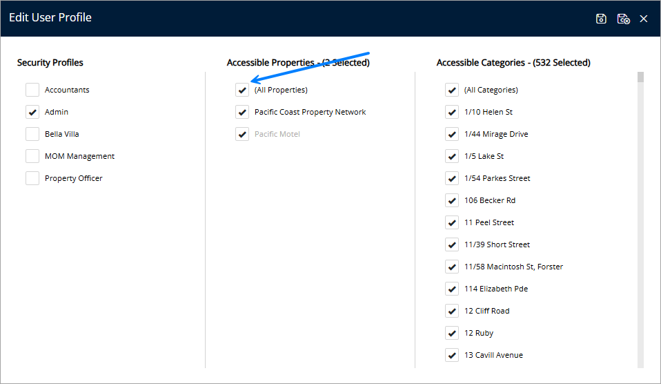 Setup + User + User Information + Profiles + Open the Profile and set All Properties