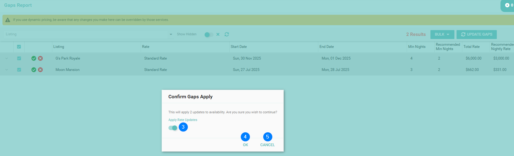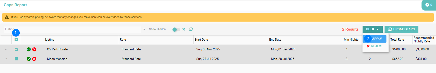 The Gaps Report helps you identify unbookable gaps between reservations caused by current minimum night settings. You can activate gap suggestions and optionally apply rate adjustments. Any changes to minimum nights will be set as "Lock Nights", meaning future Season updates won’t override these restrictions. If you use dynamic pricing, be aware that any changes you make here can be overridden by those services.