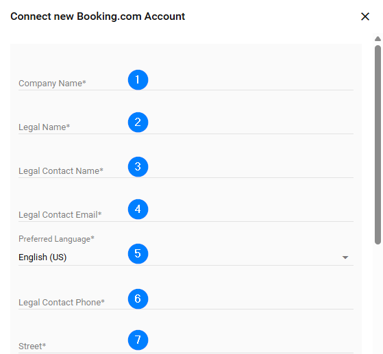 If you click Connect New Booking.com Account, you must fill in all necessary details to create a new Legal Entity within Booking.com.