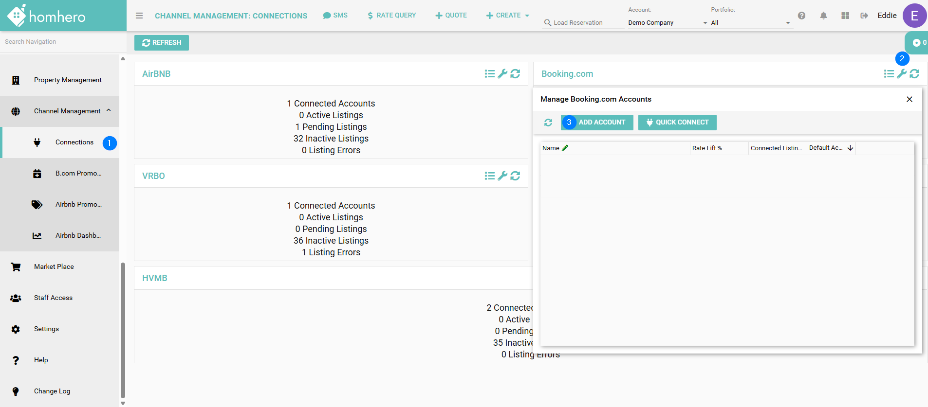 - Click Channel Management > Connections from the Homhero side menu.