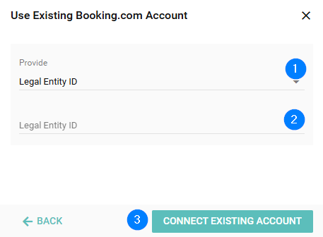 If you click Use Existing Booking.com Account, you may connect via your Legal Entity ID (LEID) or Email address associated with the account.