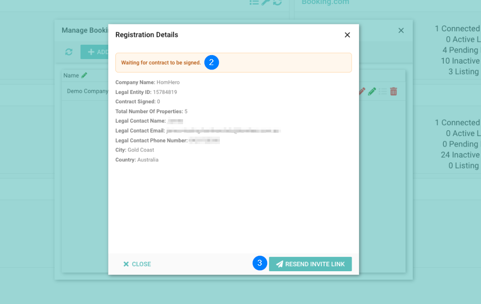 - Click Resend Invite Link if you would like to resend the registration details to Booking.com.