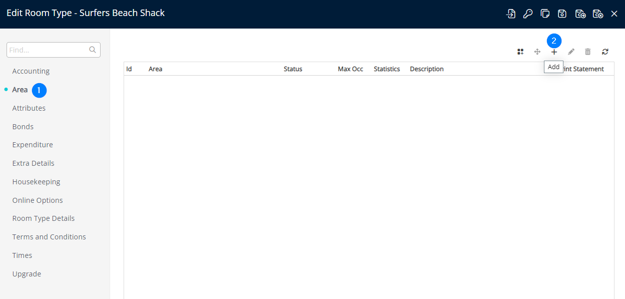 After saving your new Property as a Room Type, some additional tabs will appear on the left. The next step is to create an Area which is the physical allotment for the Property. This is required to dictate how many Areas can be sold online. If you are setting up an entire Property, then you would have 1 Room Type and 1 assigned Area.