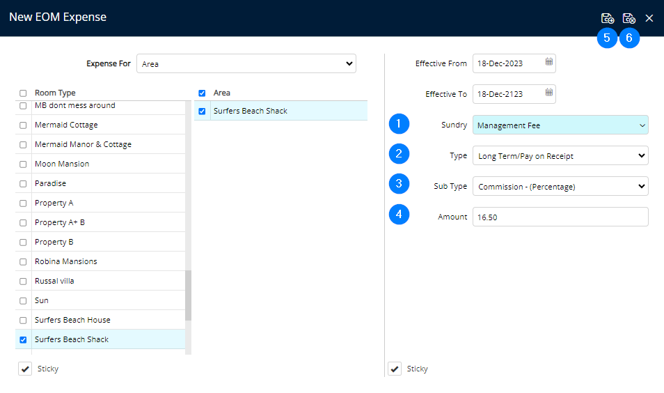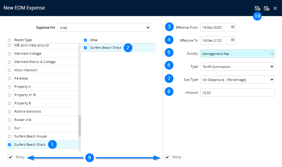 e.g. 15% Commission = 16.50% including GST - Select the 2 x Sticky Boxes. This saves the current information to make it easier for setting up your next EOM Expense