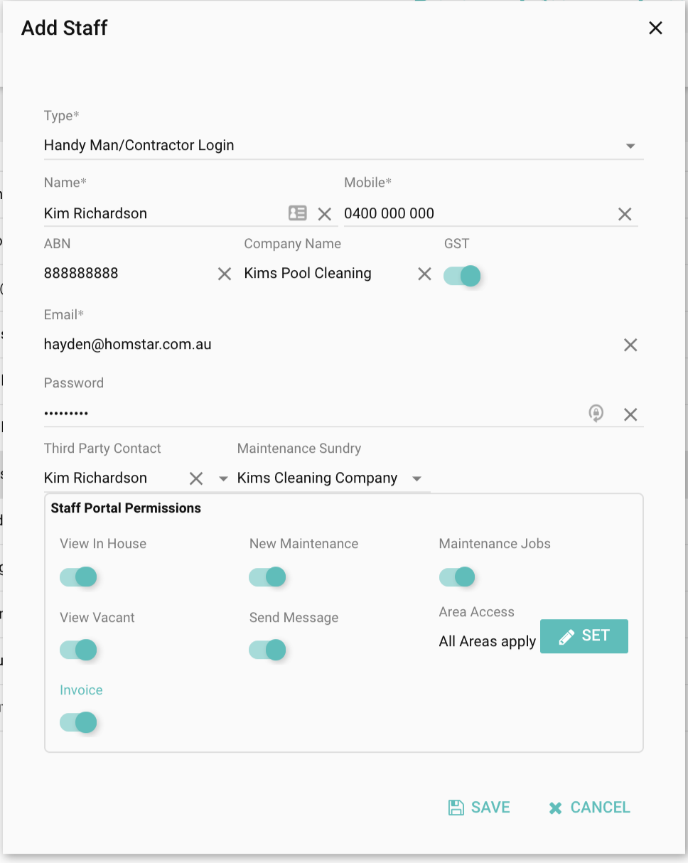 - Staff Portal Permissions - Toggle on or off the level of access the Handy Man/Contractor has within the app.