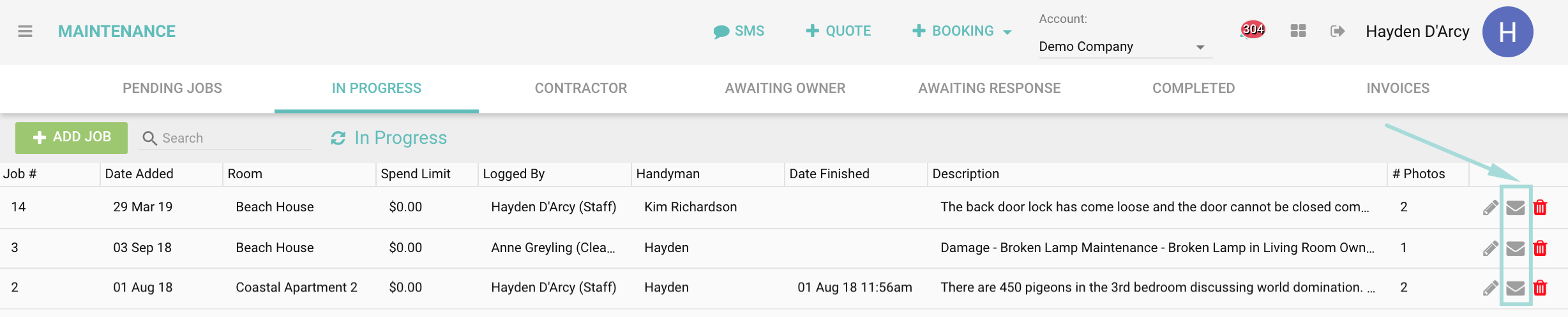 - Find the maintenance task and click on the envelope to the right of the maintenance job. This will send the owner a text message with a link to the job in their owners portal, and an email with notes, details and a link.