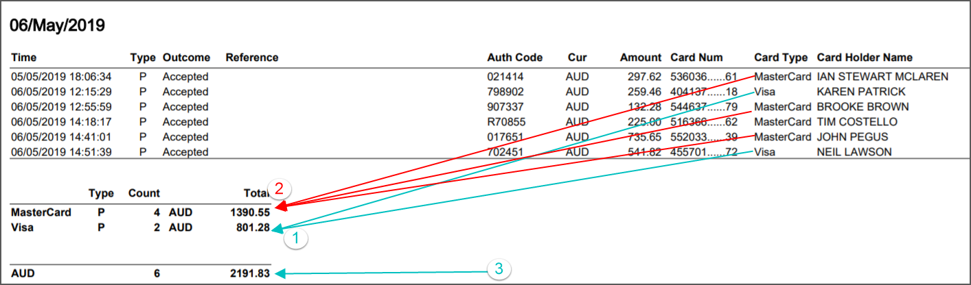 - The Report is split into settlement amounts by credit card type
