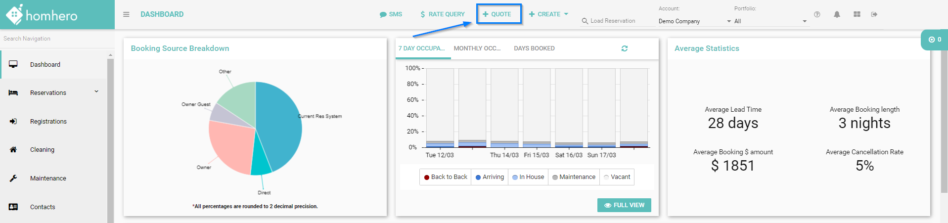 Quotes can be sent to guests via the Quote button located at the top of your Homhero screen. This button can be selected from any page in Homhero.