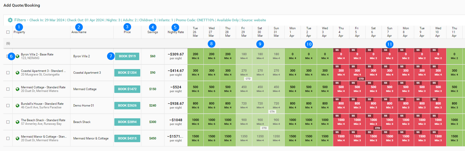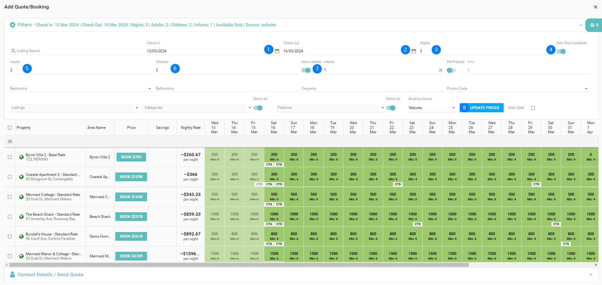 Once you click 'Update Prices', you will see all listings that fit within your search parameters to select from and send to the guest. We have highlighted all features within the quote grid to help you understand the quote before you proceed: