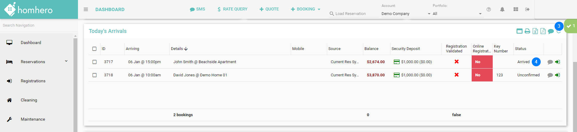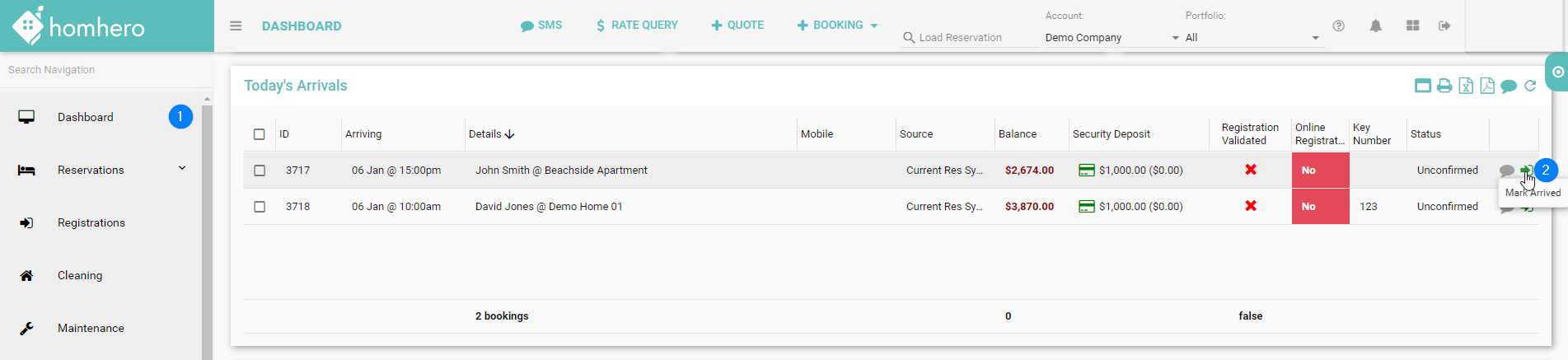 The below article will explain how to mark a reservation as Arrived from the Dashboard.