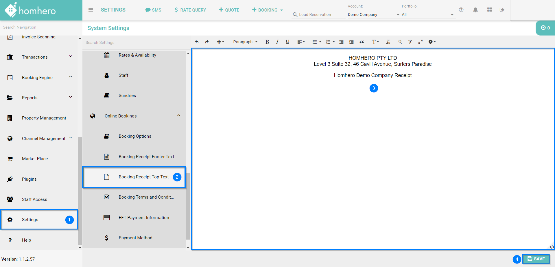 Please follow the below steps to update your Booking Receipt Top Text: