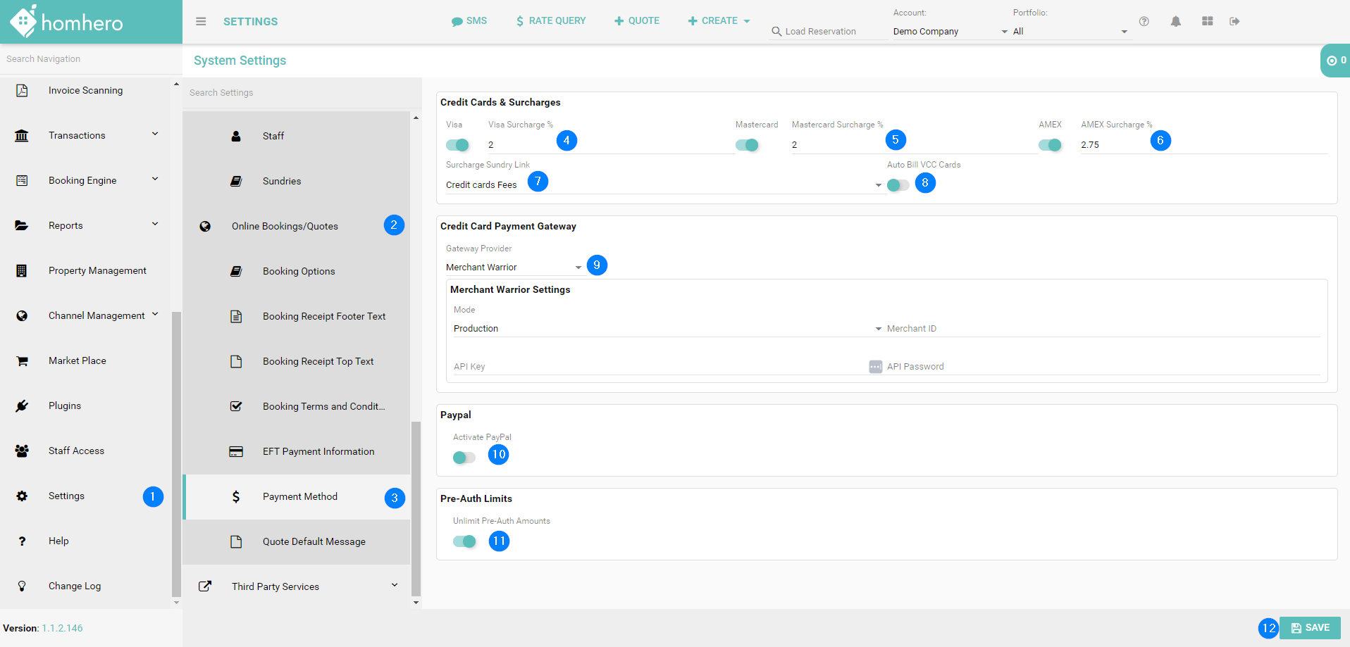 - Surcharge %: This will inflate the payment amount by this value - Click the toggle to enable Unlimit Pre-Auth Amounts. This allows you to take unlimited pre-authorisations on a booking.