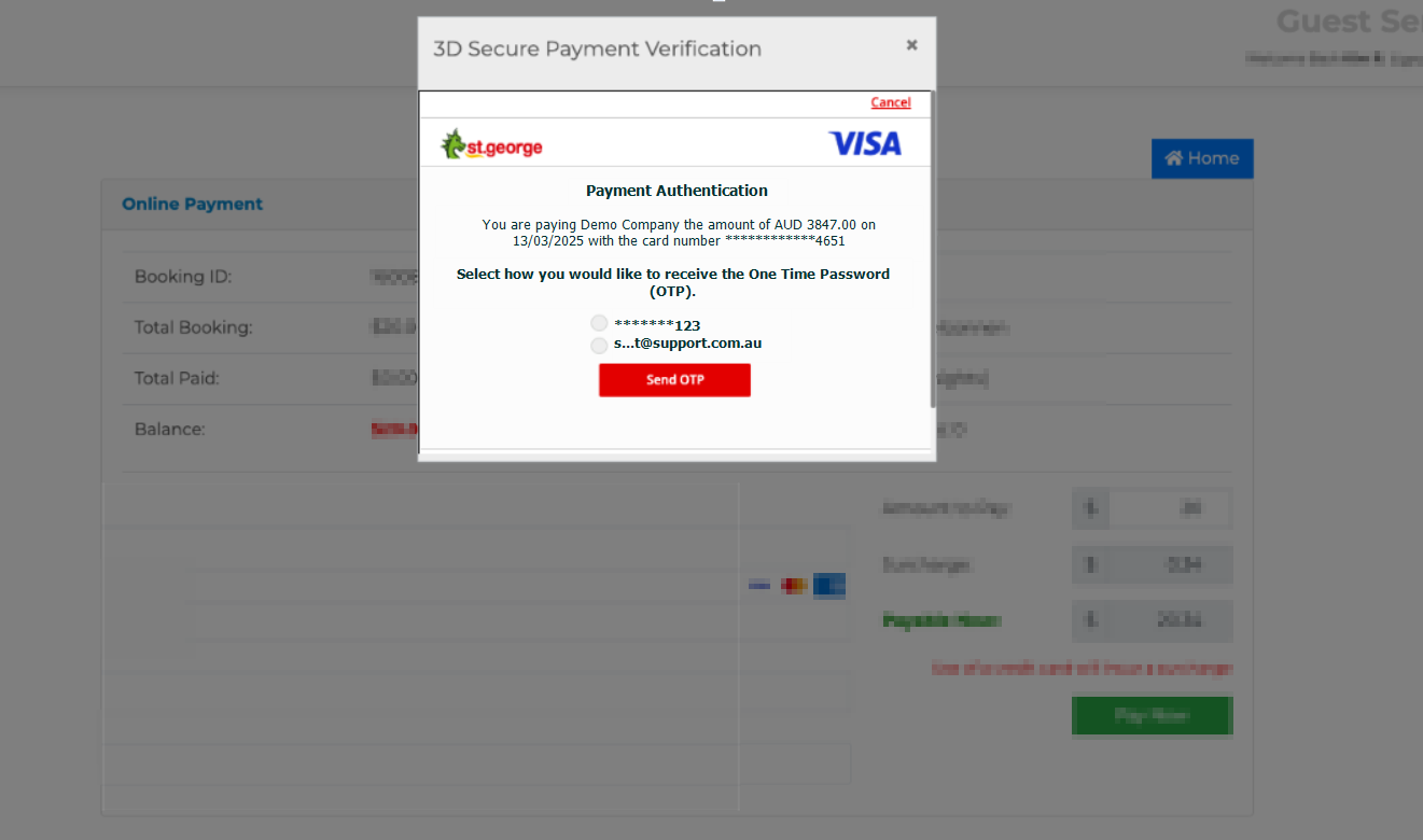 - When completing the payment, if 3DS2 is enabled with Merchant Warrior, the guest may receive a 3D Secure Payment Verification message. They can choose to receive the One-Time Password (OTP) via email or SMS. OTP verification is required only for merchant websites that support 3D Secure (3DS) authentication protocols, providing an added layer of security for online transactions.