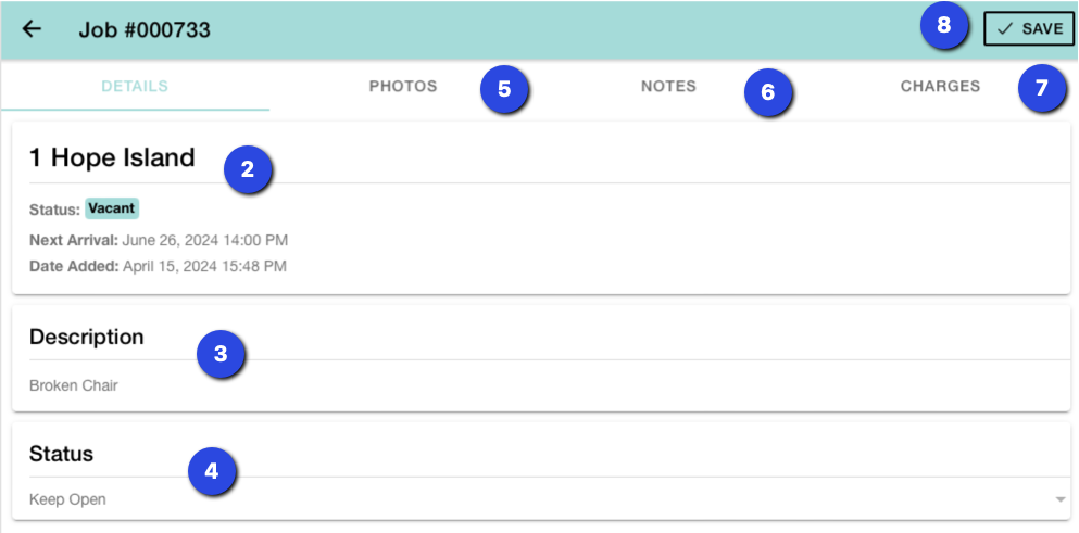Property name, Status of the property and Date maintenance job was added is shown at the top.