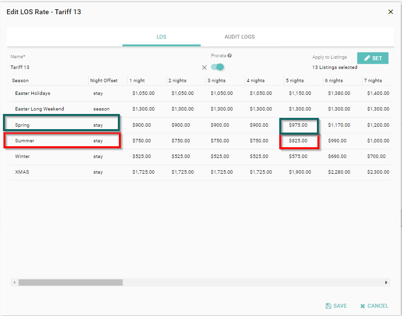 We have provided some examples below of different ways your Seasonal LOS Rates will calculate when a reservation overlaps different seasons.