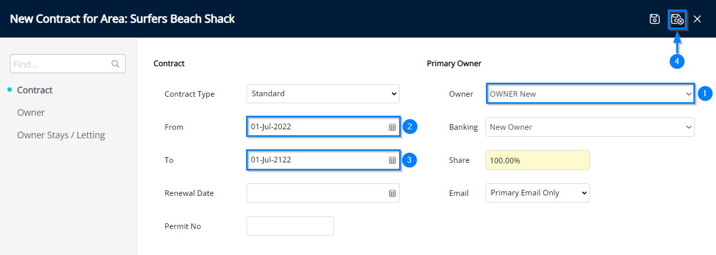NOTE: You can have up to 5 x different Owners share in one management. To find out how to a create shared ownership click here. - Ensure the From Date of the contract is set to the 1st date of the month. Any bookings that depart before this date will not be included in the owner's first disbursement