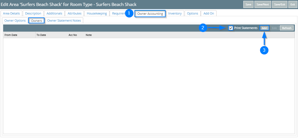 - On the 'Edit Area' page, select the Owner Accounting tab