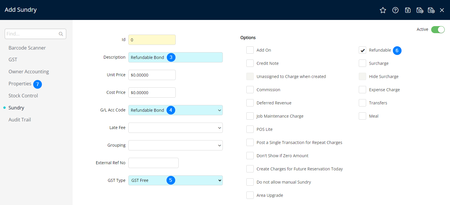 This type of sundry is only used in a reservation for Security Deposits/Bonds. The Bond must be setup as GST free. A bond must also go to the Extras tab in a booking. Funds for a booking will not be paid out to the owner if the booking is unbalanced. If the bond is held in Extras it will not affect the payout to the owner.