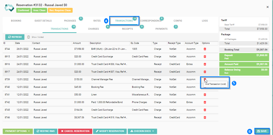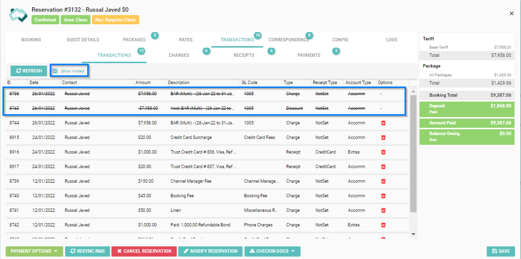 To view all Charges that have been voided from the reservation, tick the 'Show Voided' box next to the Refresh button