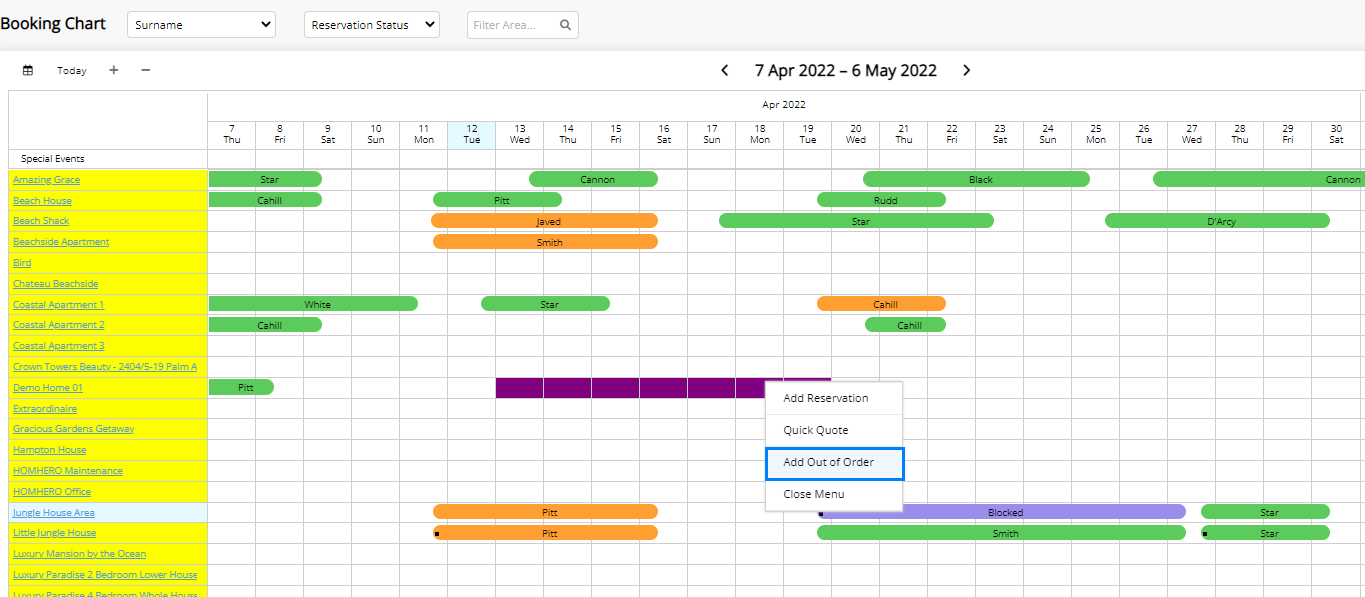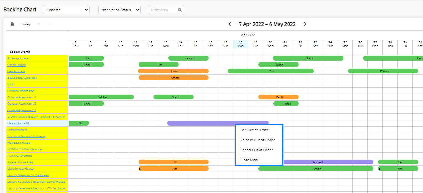 If you wish to modify the Maintenance Block, right click on the reservation from the Bookings Chart and select Edit Out of Order