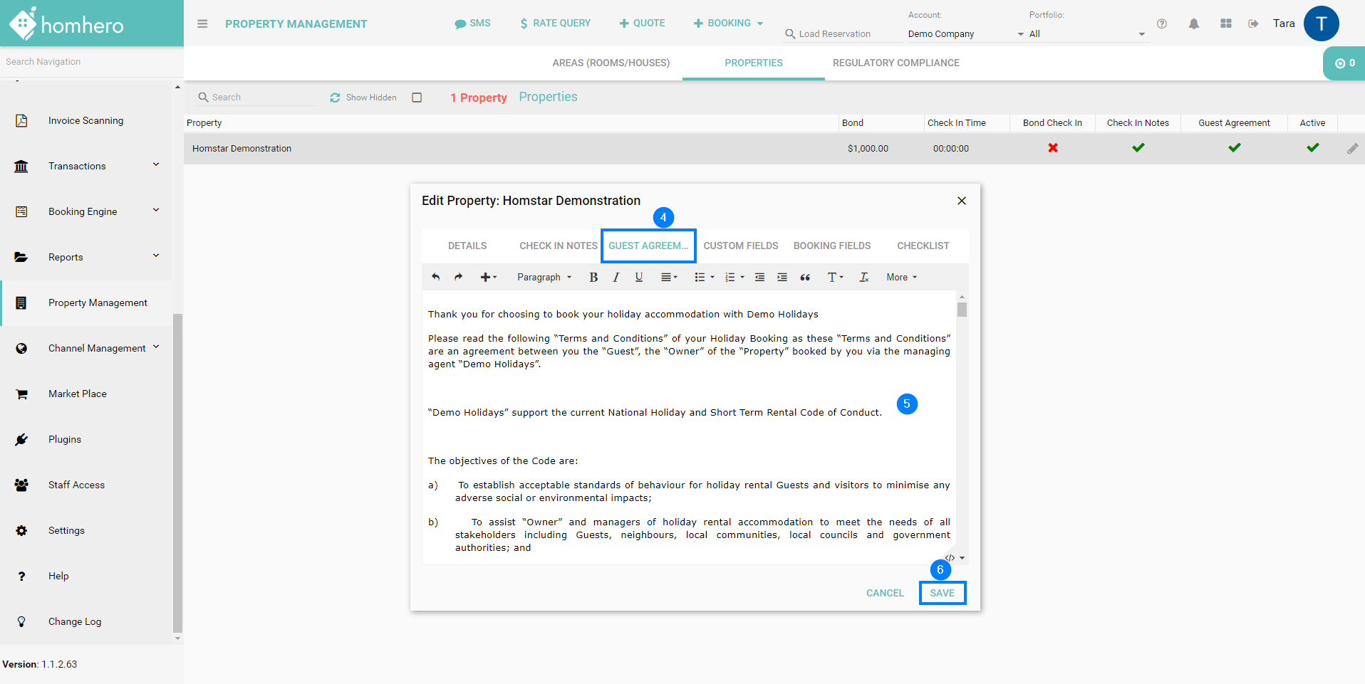 If you have a Guest Agreement (Lease Agreement) that differs for a particular property, this will override the Guest Agreement in your global settings under the Properties tab. You can add or update this as per the following steps: