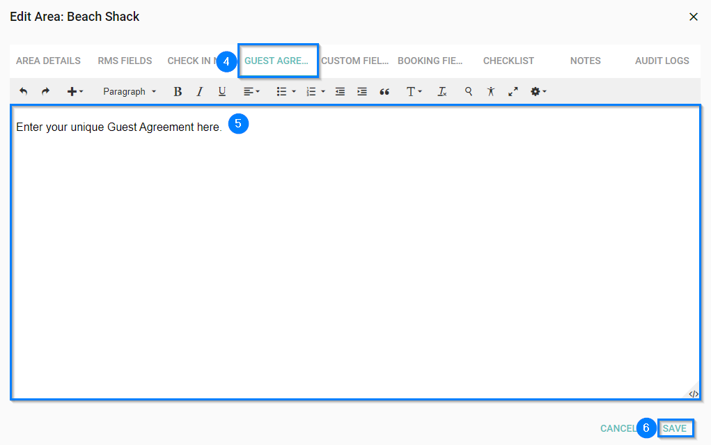 - Copy and paste your Guest Agreement here which will override the Guest Agreement you have in the "Properties" tab as mentioned above