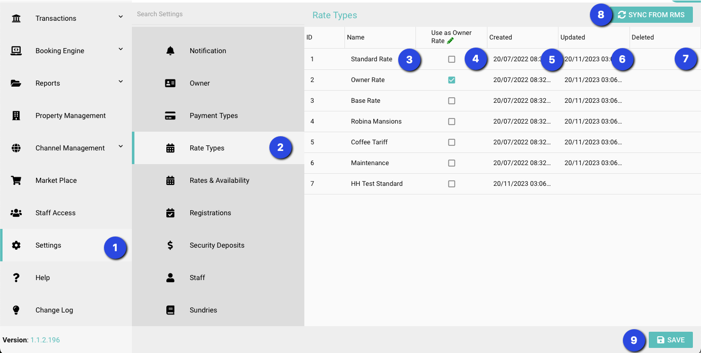 The Rate Type Settings will display a list of all Rate Types that have been synced from RMS to Homhero. If you’ve set up a new Standard Rate/Base Rate in RMS, you won’t be able to map the Rate Type correctly in Homhero if it doesn’t appear in this list. These settings are also used to map an owner rate from RMS to your owner bookings in Homhero.