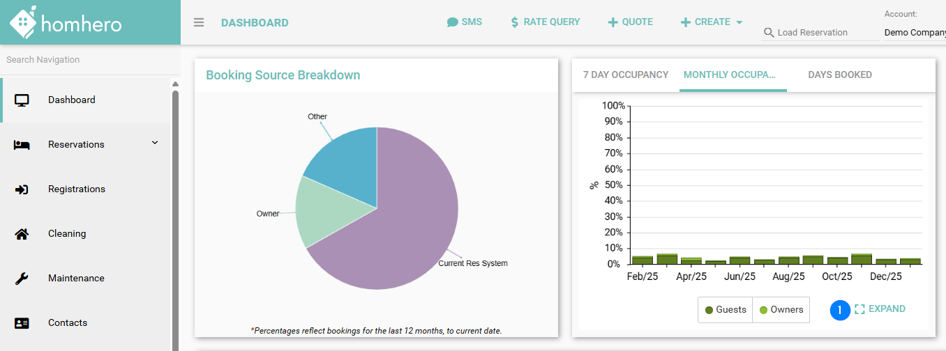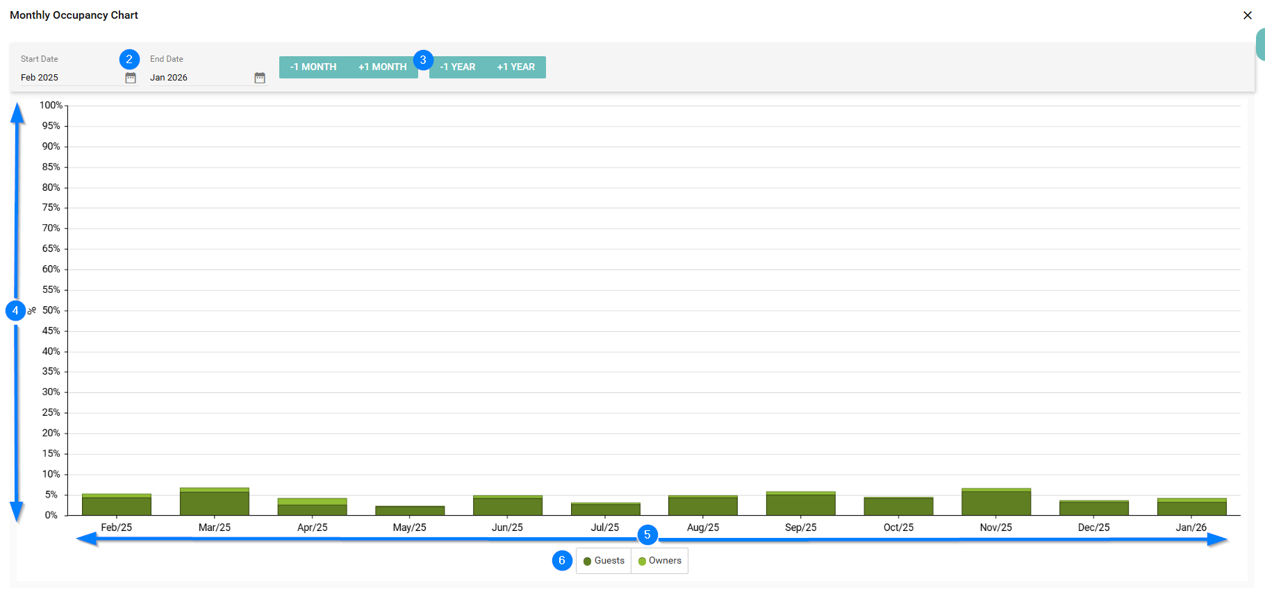 The Monthly Occupancy Chart shows your occupancy on a month-by-month basis, focusing on the current and previous months. It highlights the percentage of available nights that were booked in each month, giving you a clear view of recent performance.