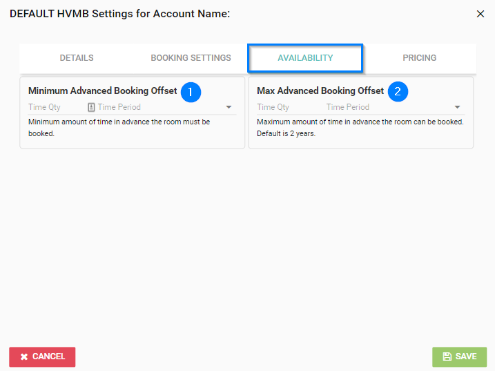 - Minimum Advanced Booking Offset - The minimum amount of time in advance the room must be booked