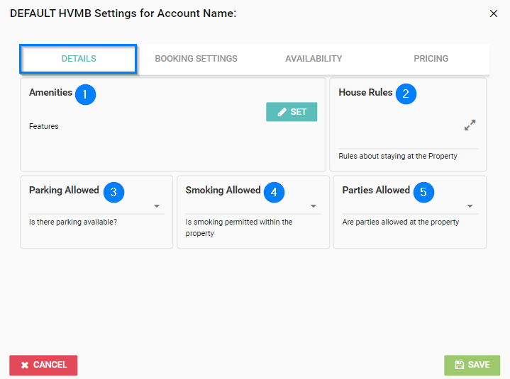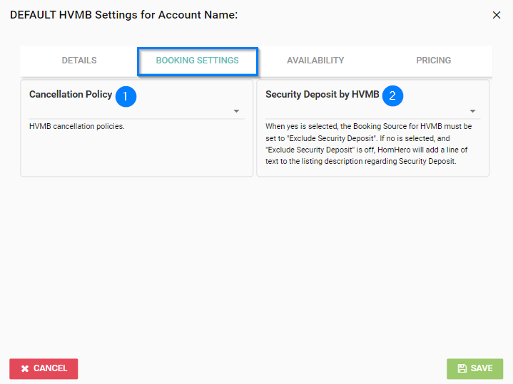- Cancellation Policy - Select a default Cancellation Policy to apply to all HVMB listings: