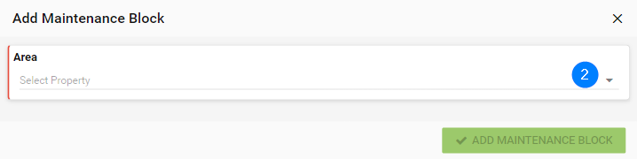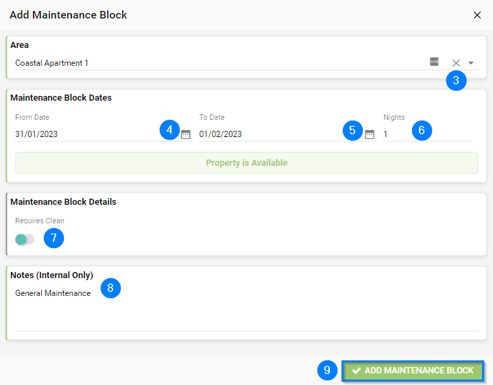 Note: You can also create Maintenance Blocks directly from the Reservations Chart. Simply drag the selected to and from dates on the Area and click the Maintenance Block booking type to proceed. This will automatically pre-fill the Property and Maintenance Block Dates for you.