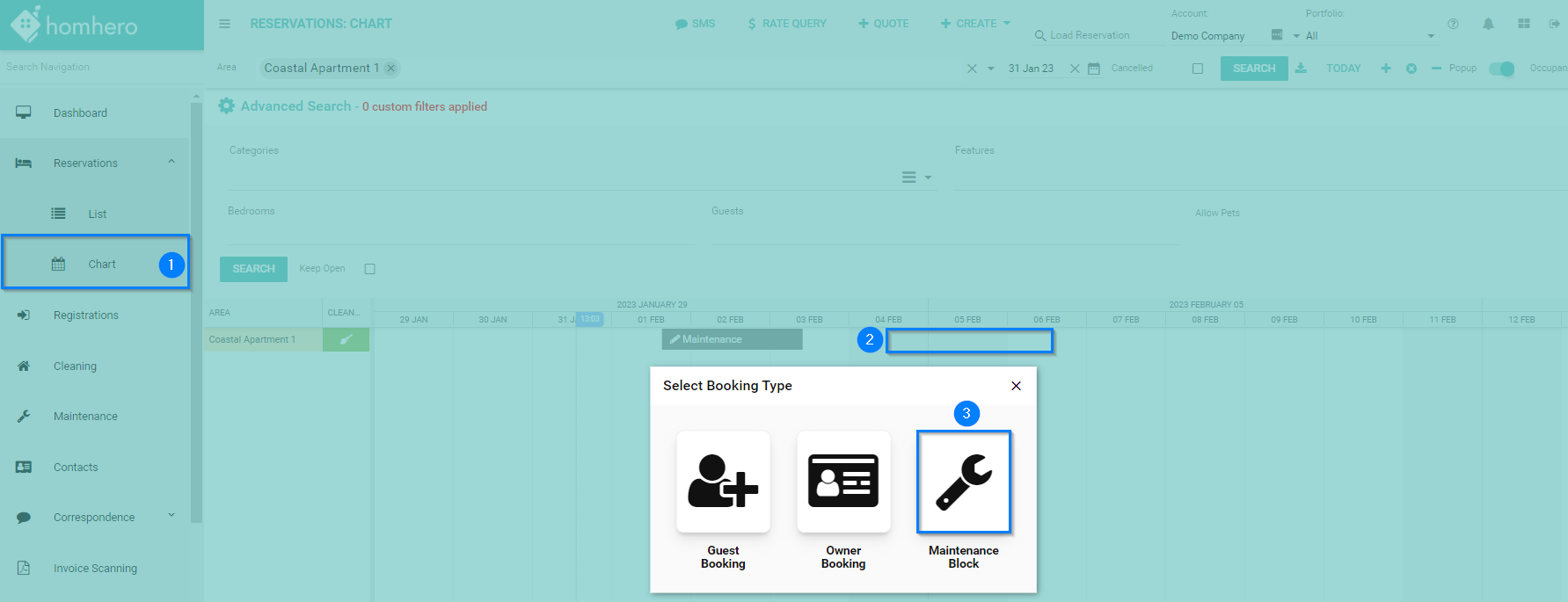 This article will explain how to add a Maintenance Block via Homhero. Maintenance blocks are used to block off a specific amount of time to allow owners/administrators to schedule maintenance and repairs for a property whilst removing the availability to online channels.